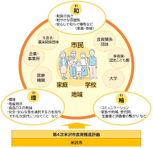 さらに、このスローガンは、上杉鷹山公の「なせば成る」の精神を礎に、一人ひとりの食育活動をさらに広げ、様々な食育を支える人との関わりや世代を超えたつながりを深めていくことを目指しています。それぞれの「わ」が相互に作用し、掛け合わさることで生み出される相乗効果によって、食育を通して持続可能な社会の実現に向けた取り組みを推進します。