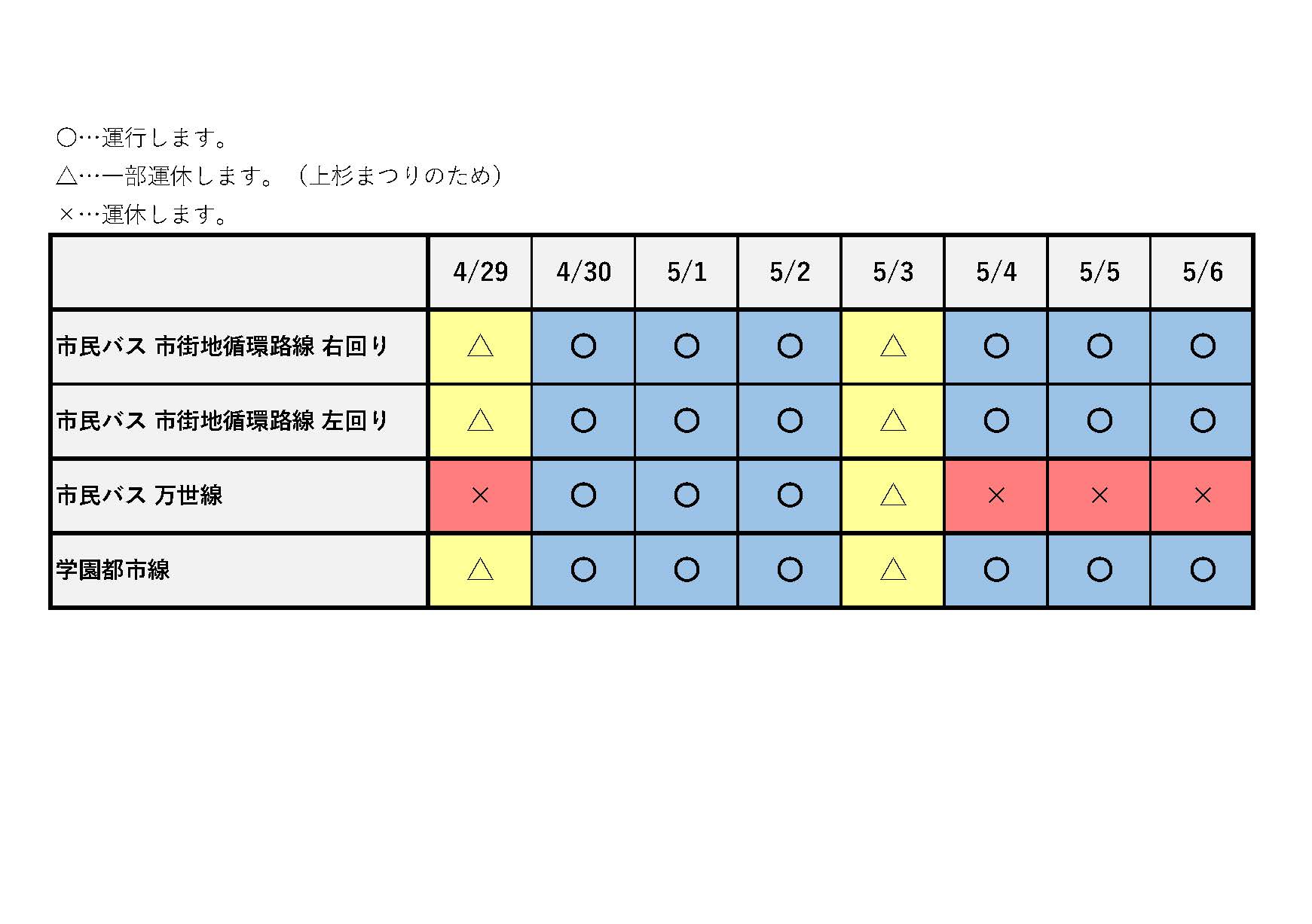 【バス】GW期間中の運行について 更新日:2026年04月24日 ページID: 11113 ゴールデンウィーク期間中のバスの運行については、次の図のとおりとなっています。一部運休(運休便)については、市民バスのページまたは学園都市線のページでご確認ください。 PDF(PDFファイル:177KB)