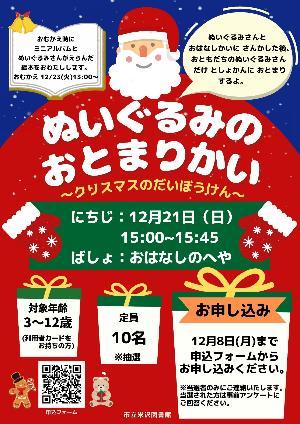 大人気イベント!「ぬいぐるみのおとまりかい」をクリスマスの時期に開催します。 ぬいぐるみさんとおはなしかいに参加した後、おともだちのぬいぐるみさんだけ図書館にお泊まりします。 ぬいぐるみさんのおむかえ時に「ぬいぐるみさんが選んだ絵本」をご紹介いたします。夜の冒険をまとめたミニアルバムとともに、ぜひお家で絵本も楽しみください。 |
