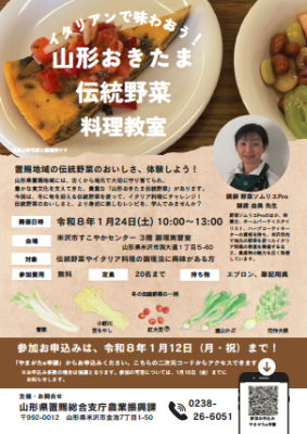 山形県置賜地域には、古くから地元で大切に育てられ、豊かな食文化を支えてきた、貴重な伝統野菜があります。 今回、冬に旬を迎える雪菜や小野川豆もやしなどの伝統野菜を使ったイタリア料理教室が開催されます。 伝統野菜のおいしさとレシピを学んでみませんか?