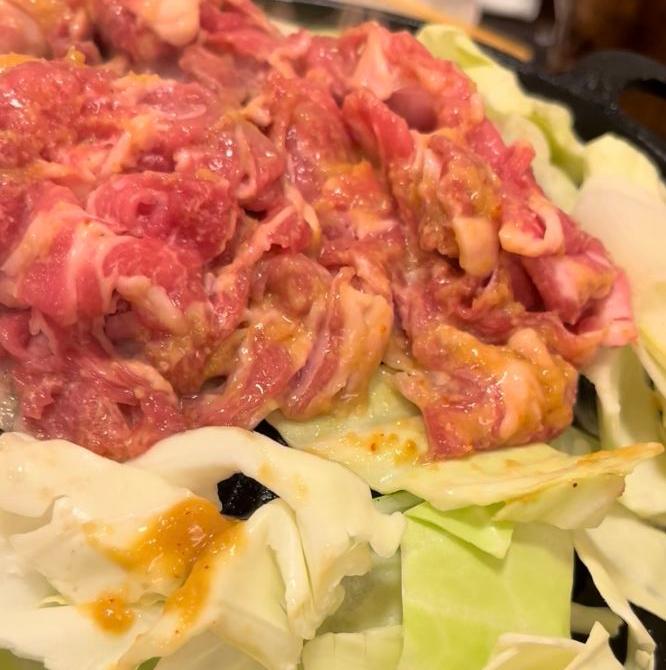 味噌だれをまとった羊肉を鍋や鉄板にのせ、キャベツや玉ねぎ、長ねぎなどの野菜とともに焼き上げます。強すぎない火加減でじっくりと。タレがふつふつと音を立て、香ばしい香りが広がったころが食べごろです。