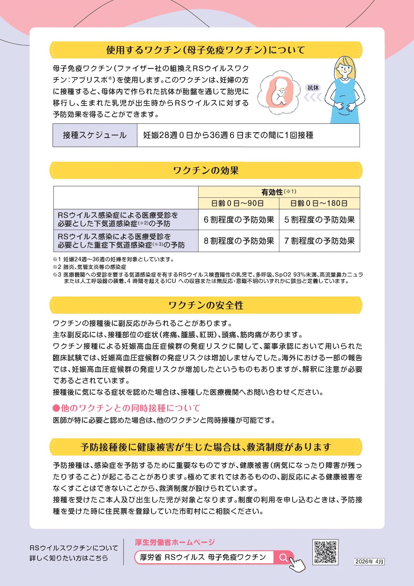 国の審議会での決定を受けて、令和8年4月1日から、RSウイルス感染症予防接種(母子免疫ワクチン)の定期接種が開始される予定です。
